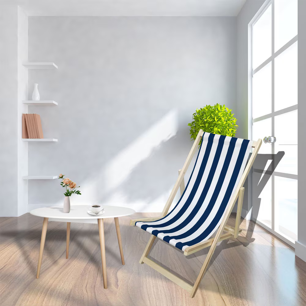 The Orpixia Populus Wood Sling Chair is designed to provide relaxed and comfortable seating for both indoor and outdoor leisure spaces. Crafted with a natural populus wood frame and a durable sling-style fabric seat, this folding lounge chair offers a balanced combination of comfort, functionality, and classic design. The blue stripe fabric adds a fresh and stylish touch, making the chair suitable for patios, terraces, gardens, balconies, and casual indoor settings.